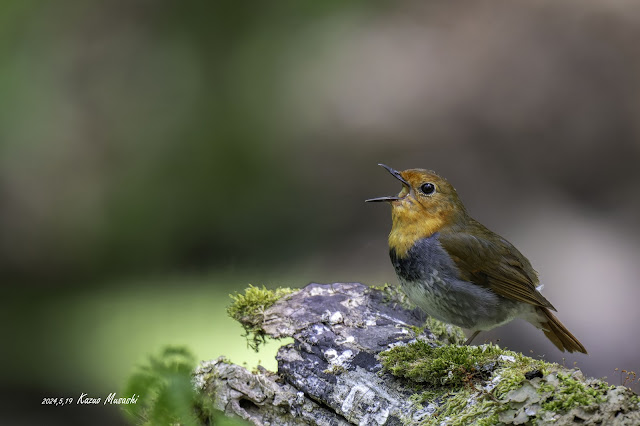 山道を上りきって昨年と同じ場所の近くに着くとなんと目の前に数人のカメラマンが・・・、すぐにそれと察しがつきましたが、軽く会釈をして少し離れたところに座って待ちました。すると数分後、すぐ目の前の古木の上でコマドリがびっくりするほどの大声で鳴き始めたではありませんか・・・。昨年はここから更に奥に入った暗い場所、まさかこんな開けた明るい場所で、しかも数人が大きなカメラで見つめる場所でコマドリが鳴き始めるなんて・・・驚きながらも夢中でシャッターを押し続けました。
